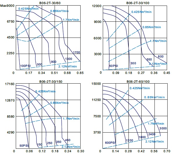 Booster Model Code Max.Gas Supply Min.Gas Supply Max.Rated Gas Outlet(psig) - Inert Gas Max.Rated Gas Outlet(psig) - Hydrogen Max.Rated Gas Outlet(psig) - Oxygen Actual ML Per Cycle Outlet Stall Press. Formula Compression Ratio Max. Max.barrel Safe Pressure (First stage) Max.barrel Safe Pressure (Second stage) LEB06-2T-14/30 12 Pa 25psig 5000 5000 5000 216ML 30 Pa+2 Ps 50:1 2500psig 5000psig LEB06-2T-14/60 4 Pa 25psig 9000 9000 5000 216ML 60 Pa+4 Ps 100:1 2500psig 9000psig LEB06-2T-30/60 30 Pa 100psig 9000 9000 5000 102ML 60 Pa+2 Ps 50:1 5000psig 9000psig LEB06-2T-30/100 13 Pa 100psi 14500 14500 5000 102ML 100 Pa+3.3 Ps 75:1 5000psig 15000psig LEB06-2T-30/150 7 Pa 100psig 15000 15000 5000 102ML 150 Pa+5 Ps 100:1 5000psig 25000psig LEB06-2T-60/100 90 Pa 100psig 15000 15000 5000 51ML 100 Pa+1.6 Ps 40:1 9000psig 15000psig LEB06-2T-60/150 40 Pa 100psig 25000 15000 N/A 51ML 150 Pa+2.5 Ps 60:1 9000psig 25000psig * When the pressure of the first stage exceeds the Max.barrel Safe Pressure listed in the table. Install interstage relief valve set at this pressure.