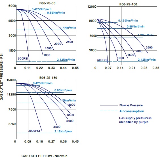 Booster Model Code Max.Rated Gas Supply Min.Rated Gas Supply Max.Rated Gas Outlet (psig) - Inert Gas Max.Rated Gas Outlet (psig) - Hydrogen Max.Rated Gas Outlet (psig) - Oxygen Actual ML Per Cycle Outlet Stall Press. Formula Compression Ratio Max. Inlet & Outlet Gas Ports LEB06-2S-60 9000psig 200psig 9000 9000 5000 51 ML 60 Pa 25:1 1/4"HF LEB06-2S-100 12000psig 100psig 12000 12000 5000 32ML 100 Pa 25:1 1/4"HF LEB06-2S-150 20000psig 250psig 20000 15000 5000 20ML 150 Pa 25:1 1/4"HF * HF means female high pressure connection.