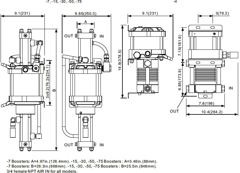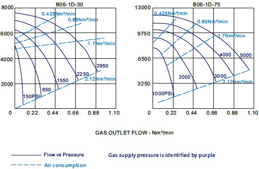 Booster Model Code Max.Rated Gas Supply Min.Rated Gas Supply Max.Rated Gas Outlet (psig) - Inert Gas Max.Rated Gas Outlet (psig) - Hydrogen Max.Rated Gas Outlet (psig) - Oxygen Actual ML Per Cycle Outlet Stall Press. Formula Compression Ratio Max. Inlet & Outlet Gas Ports LEB06-1D-4 1250psig ATM 1250 1250 1250 316ML 4 Pa+Ps 10:1 3/8"FNPT LEB06-1D-7 2500psig 25psig 2500 2500 2500 432ML 7 Pa+Ps 20:1 3/8"FNPT LEB06-1D-15 5000psig 50psig 5000 5000 5000 203ML 15 Pa+Ps 20:1 1/4"HF LEB06-1D-30 9000psig 100psig 9000 9000 5000 102ML 30 Pa+Ps 25:1 1/4"HF LEB06-1D-50 15000psig 100psig 15000 15000 5000 64ML 50 Pa+Ps 25:1 1/4"HF LEB06-1D-75 15000psig 250psig 15000 15000 5000 39ML 75 Pa+Ps 25:1 1/4"HF * HF means female high pressure connection.