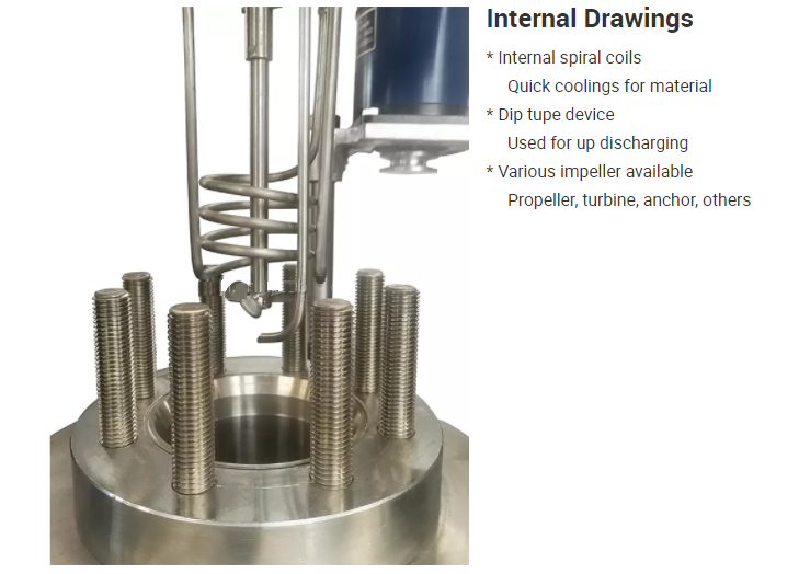 Model No. LECHPRS-5 LECHPRS-10 LECHPRS-20 LECHPRS-30 LECHPRS-40 LECHPRS-50 Nominal Capacity 5 L 10 L 20 L 30 L 40 L 50 L Design Pressure Standard 100 bar Maximum pressure up to 250 bar Material SS304, SS316 or other alloys Design Temperature Standard 350°С; Up to 500°С Stirring Speed 0-750 rpm 0-750 rpm 0-500 rpm 0-500 rpm 0-500 rpm 0-500 rpm Motor Power 0.6 kW 1.1 kW 1.5 kW 1.5 kW 1.5 kW 1.5 kW Heating Power 4 kW 9 kW 9-12 kW 12 kW 12 kW 15 kW Heating Method Standard electric heating (Thermal oil. steam, far infrared heating available) Head type Flat cover type or elliptical flange head Impeller type (Optional) Propeller paddle, anchor, spiral, turbine, gas inducing type, etc Cooling type (Optional) Internal spiral cooling cools Discharging type (Optional) Discharging from bottom or up discharge by pressure Control panel PID temperature display and control, accuracy±l °С: Stirring speed display; Operation time display; Heating voltage and current display. Pressure Gage; Thermocouple; Internal Stirring System Standard Liquid inlet and gas inlet with needle valve Dip Tube: Safety Rupture Disc; Cooling Coil Optional Solid plug port, constant feeding tank, safety valve, external condenser. Reflux pipeline, drain valve, receiver, etc.