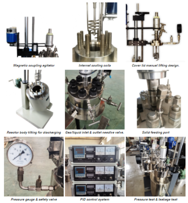 | Standard fittings | Pressure Gage: Thermocouple: Internal Stirring System; Liquid inlet and gas inlet with needle valve; Gas Release Valve Dip Tube; Safety Rupture Disc; Cooling Coil |