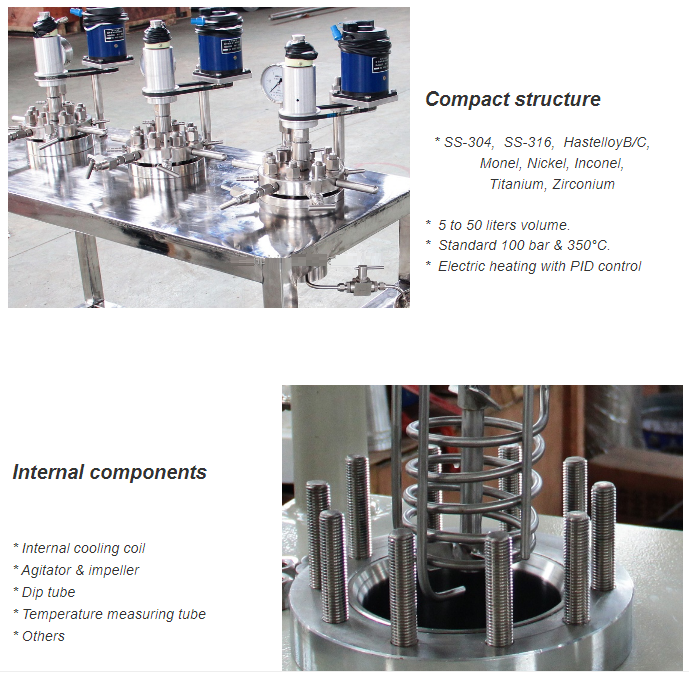 - Standard head fittings: safety rupture disc, pressure gauge, inlet/vent valve, cooling water inlet & outlet and internal thermocouple