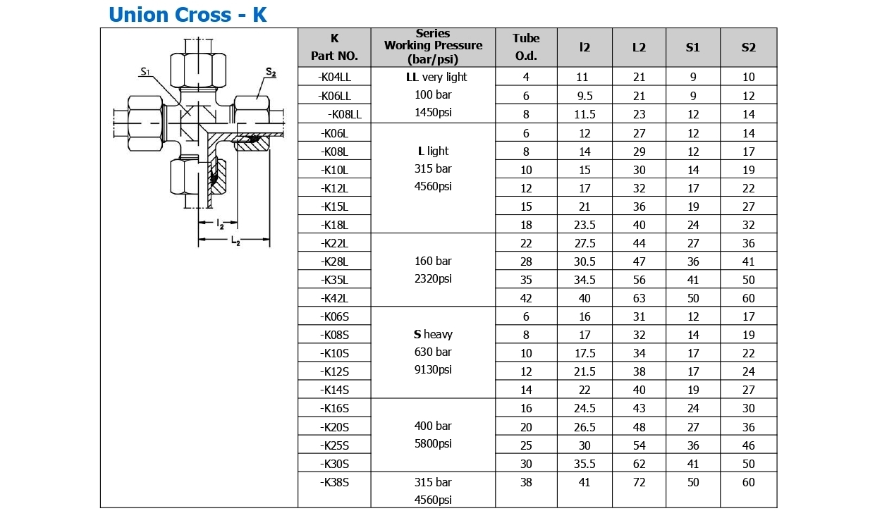 Home → Equipment →HC-276 Fittings and Valves →Hydraulic Fitting →Stainless Steel Hydraulic Fitting Single Ferrule Union CrossSend a requestSend a request SS-K-LSingle Ferrule Union Cross NameEmailPhoneCommentPage productSubmit Form DescriptionSpecification ImagesStainless Steel Hydraulic Fittings Light 6L-42L Single Ferrule 4-Way Cross Union. Technical Data Product Details Model Number: SS-K-L Material: Stainless Steel Port Size: 6L-42L Product name: Single Ferrule Union Cross Pressure: 350 Bar Work Temperature: (849.2F) 454 C Thread Type: Metric Installation: Sleeve Type Type: Compression MOQ: 20pcs Certificate: ISO9001and CE ModelSS-K-LBrandLabEquipxMaterialStainless SteelPort Size6L-42L