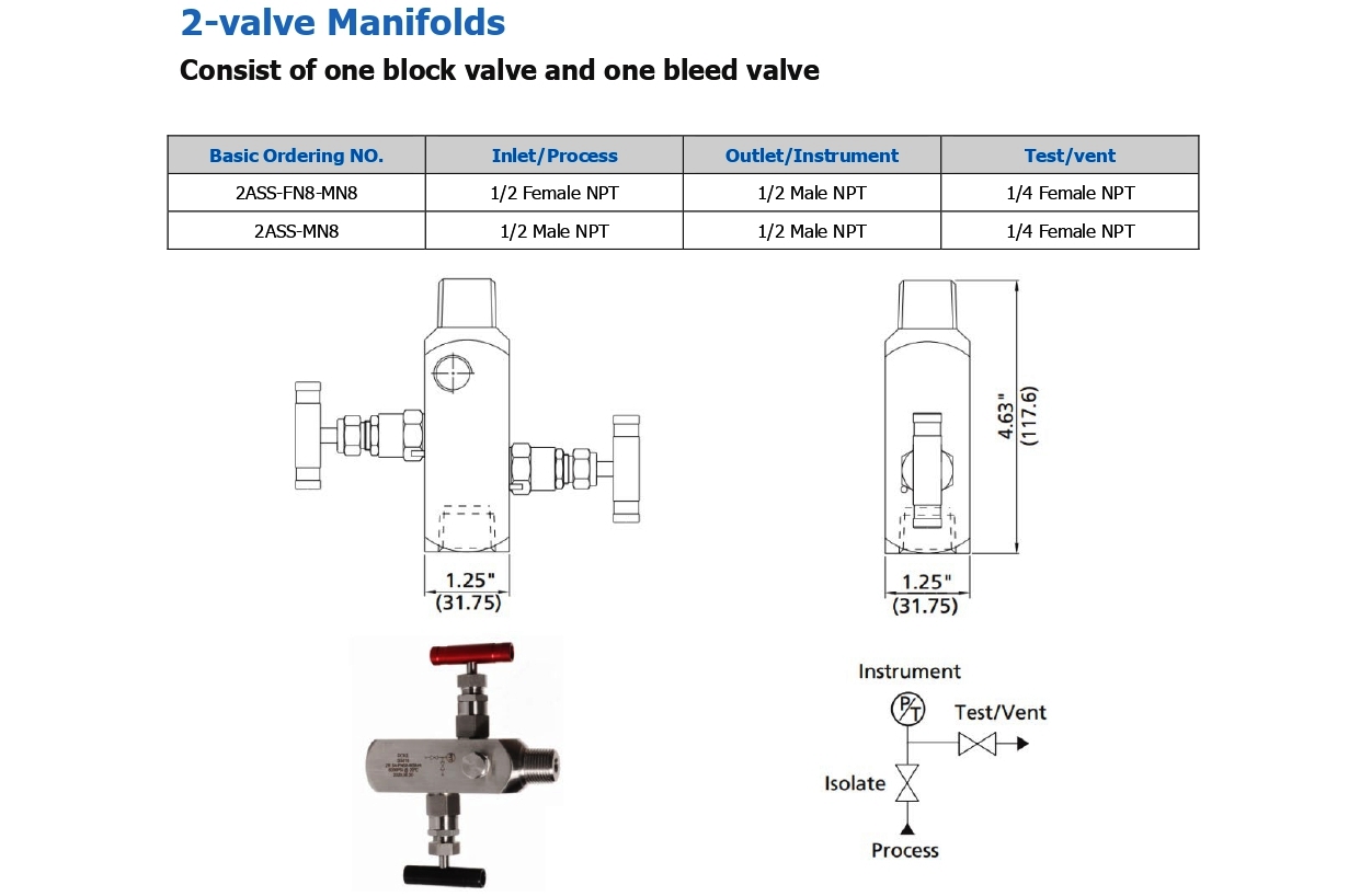 Stainless Steel 1/2"NPT Male to Female Thread 2 Valves Manifolds 6000psi.