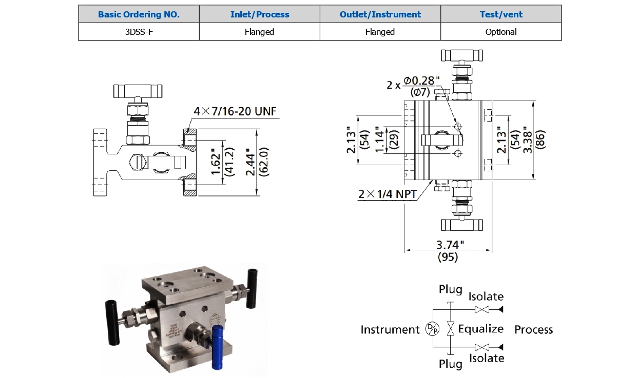 Stainless Steel SS316 Double Flange 3 Valves Integration Manifolds 6000psi.