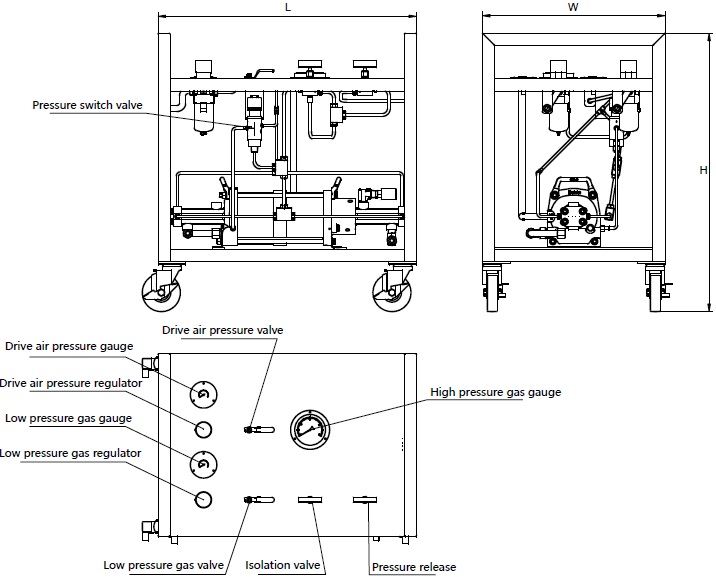 Code *Max.pressure (psi) Min.low pressure gas/pressure (DSi) Dis. flow rate(ml) Low pressure gas inlet High pressure gas outlet Drive air inlet Diemension(mm) - L Diemension(mm) - H* Diemension(mm) - W LEUG06-2D-14 5000 25 405 1/4 HF 1/4 HF 3/4NPT 800 915 600 LEUG06-2D-30 5000 50 203 1/4 HF 1/4 HF 3/4NPT 800 915 600 LEUG06-2D-60 9000 200 102 1/4 HF 1/4 HF 3/4NPT 800 915 600 LEUG06-2D-100 15000 100 64 1/4 HF 1/4 HF 3/4NPT 800 915 600 LEUG06-2D-150 25000 250 39 1/4 HF 1/4 HF 3/4NPT 800 915 600 LEUG06-1T-4 1250 4 164 3/8NPT 3/8NPT 3/4NPT 700 915 600 LEUG06-1T-7/15 5000 25 216 3/8NPT 1/4 HF 3/4NPT 700 915 600 LEUG06-1T-7/30 9000 25 216 3/8NPT 1/4 HF 3/4NPT 700 915 600 LEUG06-1T-15/30 9000 50 102 1/4 HF 1/4 HF 3/4NPT 700 915 600 LEUG06-1T-15/50 15000 50 102 1/4 HF 1/4 HF 3/4NPT 700 915 600 LEUG06-1T-15/75 15000 100 102 1/4 HF 1/4 HF 3/4NPT 700 915 600 LEUG06-1T-30/50 15000 100 51 1/4 HF 1/4 HF 3/4NPT 700 915 600 LEUG06-1T-30/75 15000 100 51 1/4 HF 1/4 HF 3/4NPT 700 915 600 LEUG06-2T-14/30 5000 25 216 3/8NPT 1/4 HF 3/4NPT 800 915 600 LEUG06-2T-14/60 9000 25 216 1/4 HF 1/4 HF 3/4NPT 800 915 600 LEUG06-2T-30/60 9000 100 102 1/4 HF 1/4 HF 3/4NPT 800 915 600 LEUG06-2T-30/100 15000 100 102 1/4 HF 1/4 HF 3/4NPT 800 915 600 LEUG06-2T-30/150 15000 100 102 1/4 HF 1/4 HF 3/4NPT 800 915 600 LEUG06-2T-60/100 15000 100 39 1/4 HF 1/4 HF 3/4NPT 800 915 600 LEUG06-2T-60/150 20000 100 39 1/4 HF 1/4 HF 3/4NPT 800 915 600 LEUG10-1D-14 5000 50 840 1/2NPT 1/2NPT 3/4NPT 800 915 600 LEUG10-1D-30 7000 50 320 1/2NPT 3/8HF 3/4NPT 800 915 600 LEUG10-1D-60 9000 50 180 3/8HF 3/8HF 3/4NPT 800 915 600 LEUG10-1D-150 9000 50 73 3/8HF 3/8HF 3/4NPT 800 915 600 LEUG10-2D-28 6000 25 840 1/2NPT 1/2NPT 3/4NPT 1060 915 600 LEUG10-2D-60 12000 25 320 1/2NPT 3/8HF 3/4NPT 1060 915 600 LEUG10-2D-120 20000 25 180 1/4NPT 3/8HF 3/4NPT 1060 915 600 LEUG10-2D-300 39000 25 72 3/8HF 3/8HF 3/4NPT 1060 915 600 LEUG10-1T-14/30 9000 25 840 1/2NPT 3/8HF 3/4NPT 800 915 600 LEUG10-1T-14/60 20000 25 840 1/2NPT 3/8HF 3/4NPT 800 915 600 LEUG10-1T-30/60 15000 25 320 1/2NPT 3/8HF 3/4NPT 800 915 600 LEUG10-1T-30/150 25000 25 320 1/2NPT 3/8HF 3/4NPT 800 915 600 Code *Max.pressure (psi) Min.low pressure gas/pressure(psi) Dis. flow rate(ml) Low pressure gas inlet High pressure gas outlet High pressure gas outlet Diemension(mm) - L Diemension(mm) - H* Diemension(mm) - W LEUG10-1T-60/150 25000 25 180 3/8HF 3/8HF 3/4NPT 800 915 600 LEUG10-2T-28/60 12000 25 840 1/2NPT 3/8HF 3/4NPT 1060 915 600 LEUG10-2T-28/120 20000 25 840 1/2NPT 3/8HF 3/4NPT 1060 915 600 LEUG10-2T-60/120 20000 25 320 1/2NPT 3/8HF 3/4NPT 1060 915 600 LEUG10-2T-60/300 39000 25 320 1/2NPT 3/8HF 3/4NPT 1060 915 600 - H* is the height of the standard type with wheel. No wheel type is selected, the height(H) is H=H*-115mm;