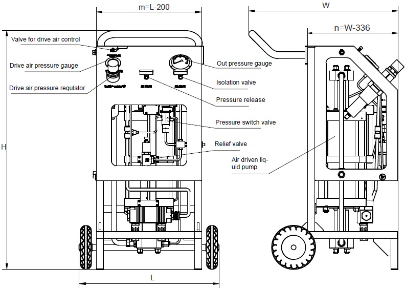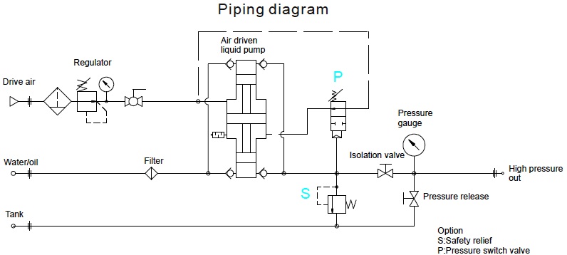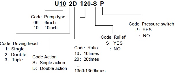 | Code | Max.pressure (psi) | Max.flow rate (l/min) | Hydraulic outlet | Drive air inlet | Diemension(mm) - L | Diemension(mm) - H | Diemension(mm) - W |
