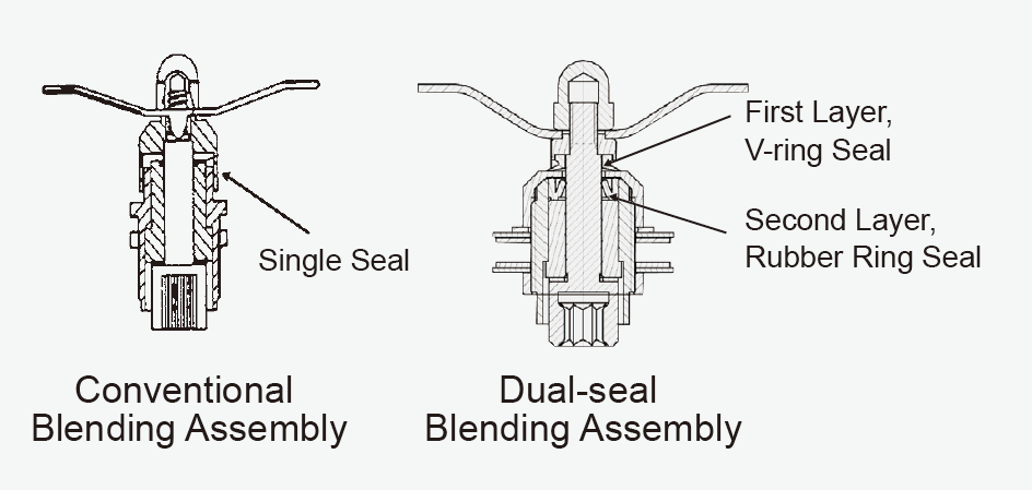 A V-ring seal is adopted to replace a conventional ring seal, because it is of better sealing performance, reduces abrasion, prolongs service life of blending assembly and saves costs. Besides, it can improve efficiency of operations by saving users’ time spent on disassembling, cleaning and replacing the blending assembly.